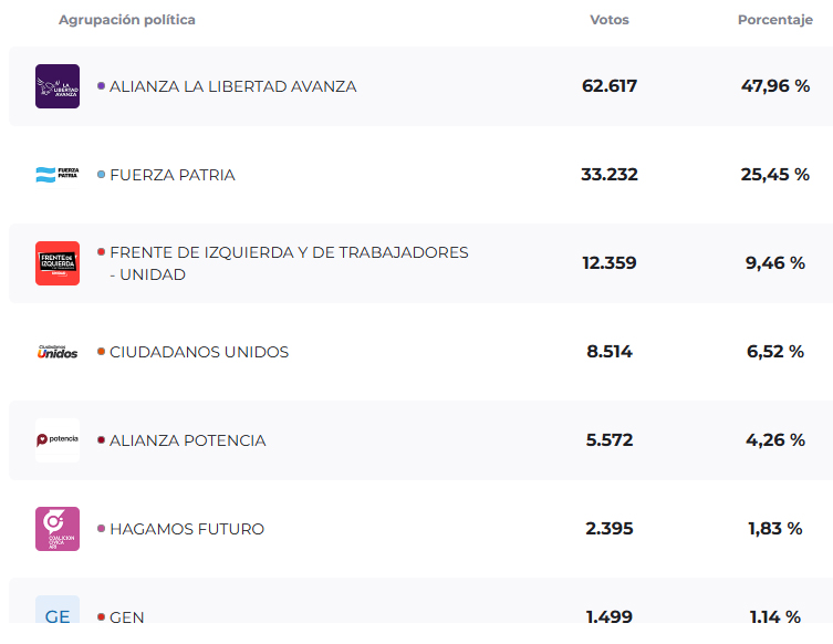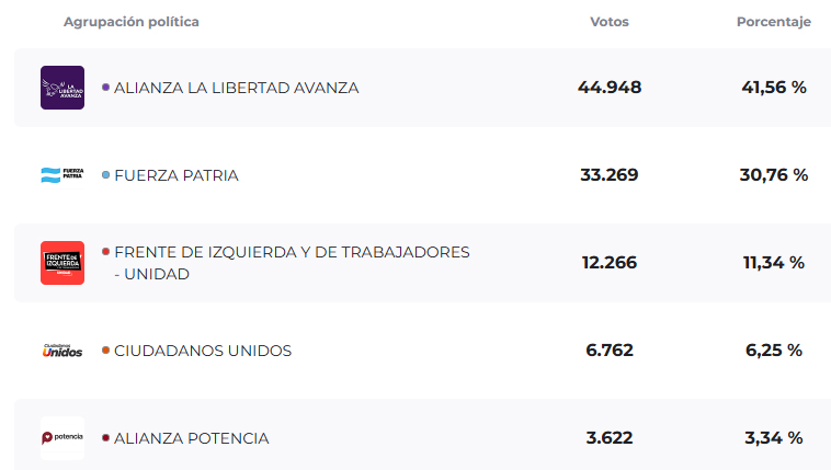 Fuerza Patria se ubicó en segundo lugar, aunque con una diferencia de más de 20 puntos, según los datos de la Dirección Nacional Electoral, dependiente del Ministerio del Interior.