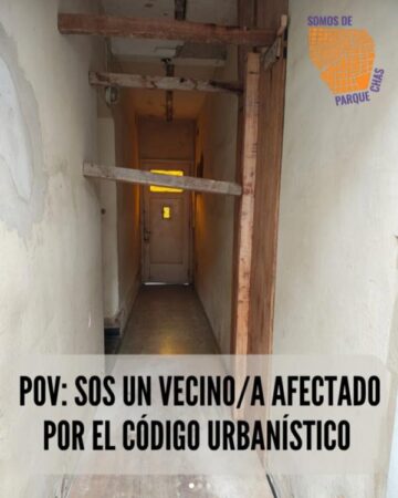 “Venden la imagen un barrio que ellos mismos están destruyendo con el aval de la normativa hecha a la medida de las desarrolladoras. Defendamos el barrio y nuestra comunidad de vecinos. El tabique que hoy sostiene este pasillo mañana puede estar en tu casa”, finaliza la denuncia.